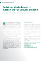 lv 1871 - berufsunfähigkeitsversicherung golden bu für schüler berufsunfähigkeitsversicherung je früher desto besser – golden bu für schüler ab zehn die lv 1871 hat das eintrittsalter für die klassische berufsunfähigkeitsversicherung gesenkt. die golden bu gibt es jetzt schon für schüler ab zehn jahren. bei der golden bu genießen schülerinnen und schüler gleich von anfang an den vollen schutz der golden bu – bei einigen versicherern erhal- ten schülerinnen und schüler dagegen nur einen ab- gespeckten schutz bei erwerbsunfähigkeit. auf eine abstrakte oder konkrete verweisung zum beispiel auf einen anderen schultyp verzichtet die lv 1871. und weil sich im leben von kindern viel ändern kann, gibt es bei der golden bu eine nachversicherungs- garantie. bei erstmaliger aufnahme eines studiums, beim beginn einer berufsausbildung oder beim start ins berufsleben können die leistungen erhöht wer- den – ohne erneute gesundheitsprüfung. die günstige einstufung als schüler bleibt in jedem fall garantiert. wenn kinder später mit dem rau- chen anfangen oder risikoreichere hobbys wie fall- schirmspringen oder tauchen für sich entdecken, ist keine veränderungsmeldung nötig. eine bessere ein- stufung beispielsweise nach dem wechsel auf eine weiterführende schule ist möglich. abschließbar ist anfangs eine berufsunfähigkeitsrente in höhe von bis zu 1.100 euro im monat. später ist die golden bu ohne gesundheitsprüfung erhöhbar auf bis zu 2.500 euro monatlich. top bewertet in ratings optional zahlt die lv 1871 bei schul- oder ar- beitsunfähigkeit von mindestens sechs monaten eine rente in höhe der berufsunfähigkeitsrente. bereits bei einer bestehenden sechswöchigen durchgängigen schulunfähigkeit kann eine bei- tragsbefreiung geltend gemacht werden. gegen einen geringen mehrbeitrag kann auch ein pflege- paket eingeschlossen werden. so erhält das kind später eine pflegerente zusätzlich zur berufsun- fähigkeitsrente. die golden bu gehört zu den topabsicherungen gegen berufsunfähigkeit am markt. sie erhält seit jahrzehnten höchstbewertungen von führenden ratingagenturen wie franke & bornberg oder morgen & morgen. lebensversicherung von 1871 a. g. münchen filialdirektion frankfurt am main thomas buchholz organisationsleiter telefon: 0170 4 53 97 07 e-mail: thomas.buchholz@lv1871.de